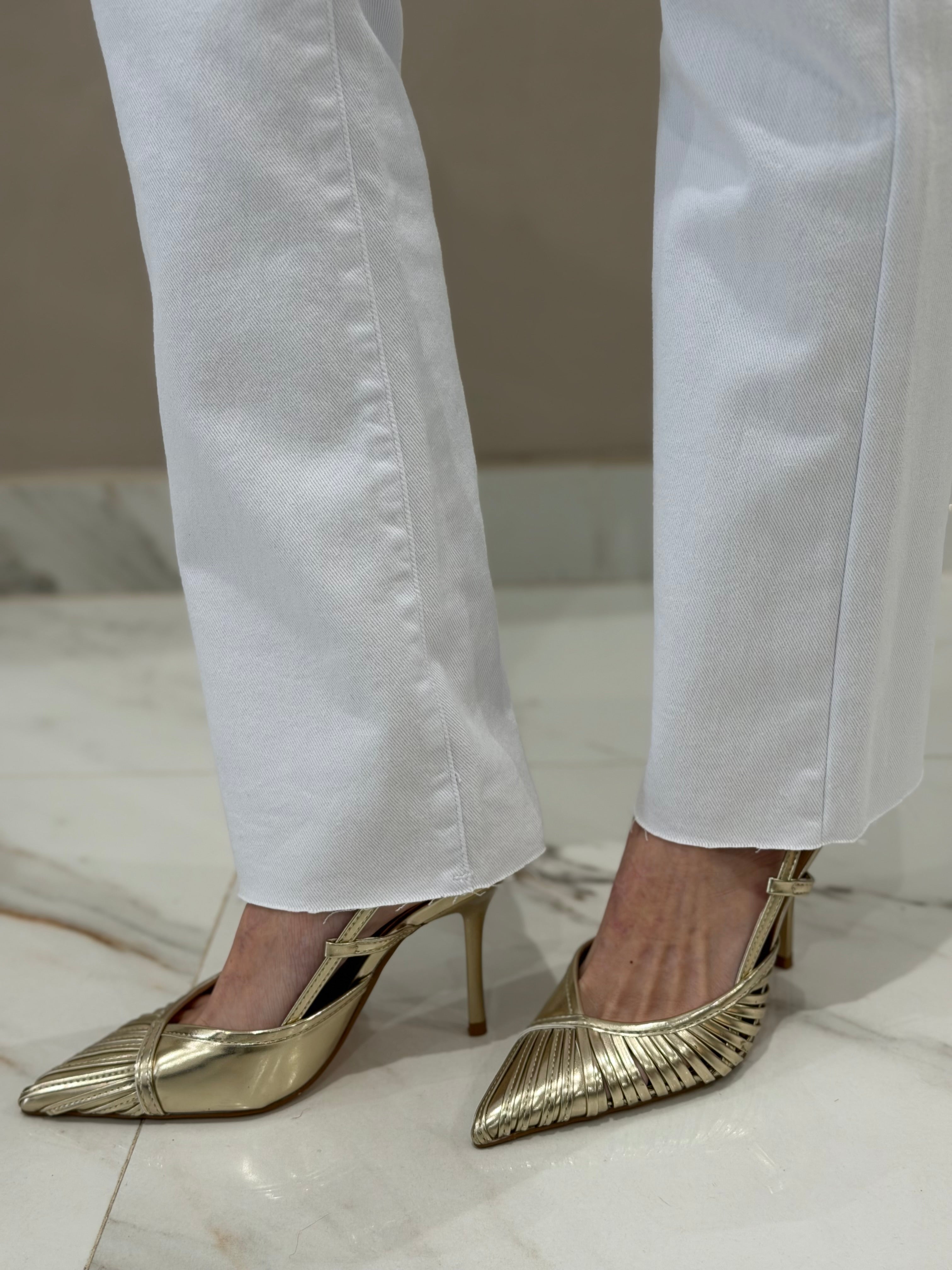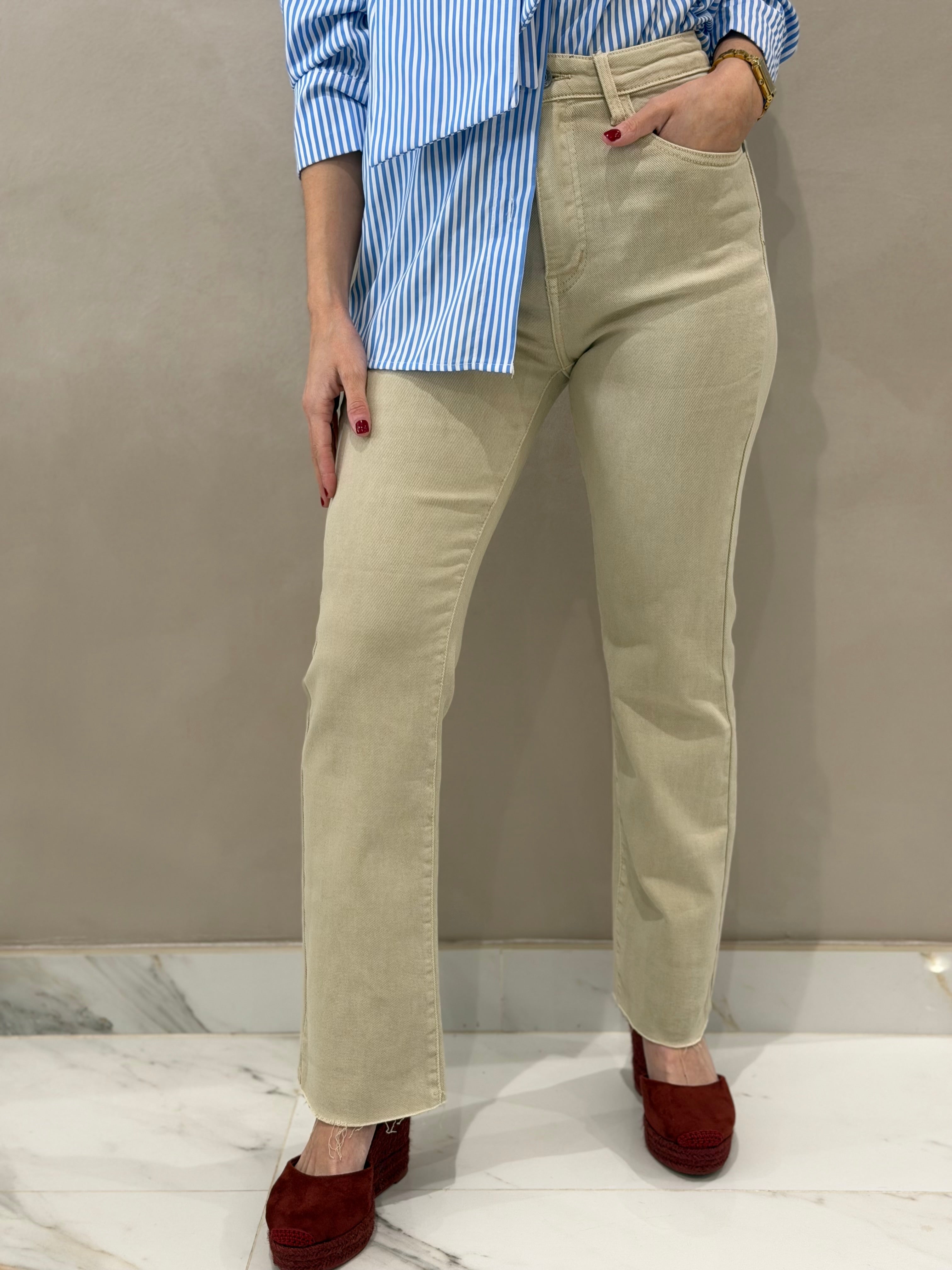 Vaquero de tiro alto que estiliza la figura y proporciona sujeción óptima. Confeccionado en tejido elástico que garantiza comodidad en cada movimiento sin comprometer la estructura. Diseño funcional con cinco bolsillos y silueta que se ajusta en el muslo para luego caer recto, creando líneas limpias y alargadas. Detalle de bajo desflecado que añade textura y un toque contemporáneo. Pieza versátil que combina practicidad con estética actual, ideal para looks casuales sofisticados o propuestas más elaboradas según el estilismo.