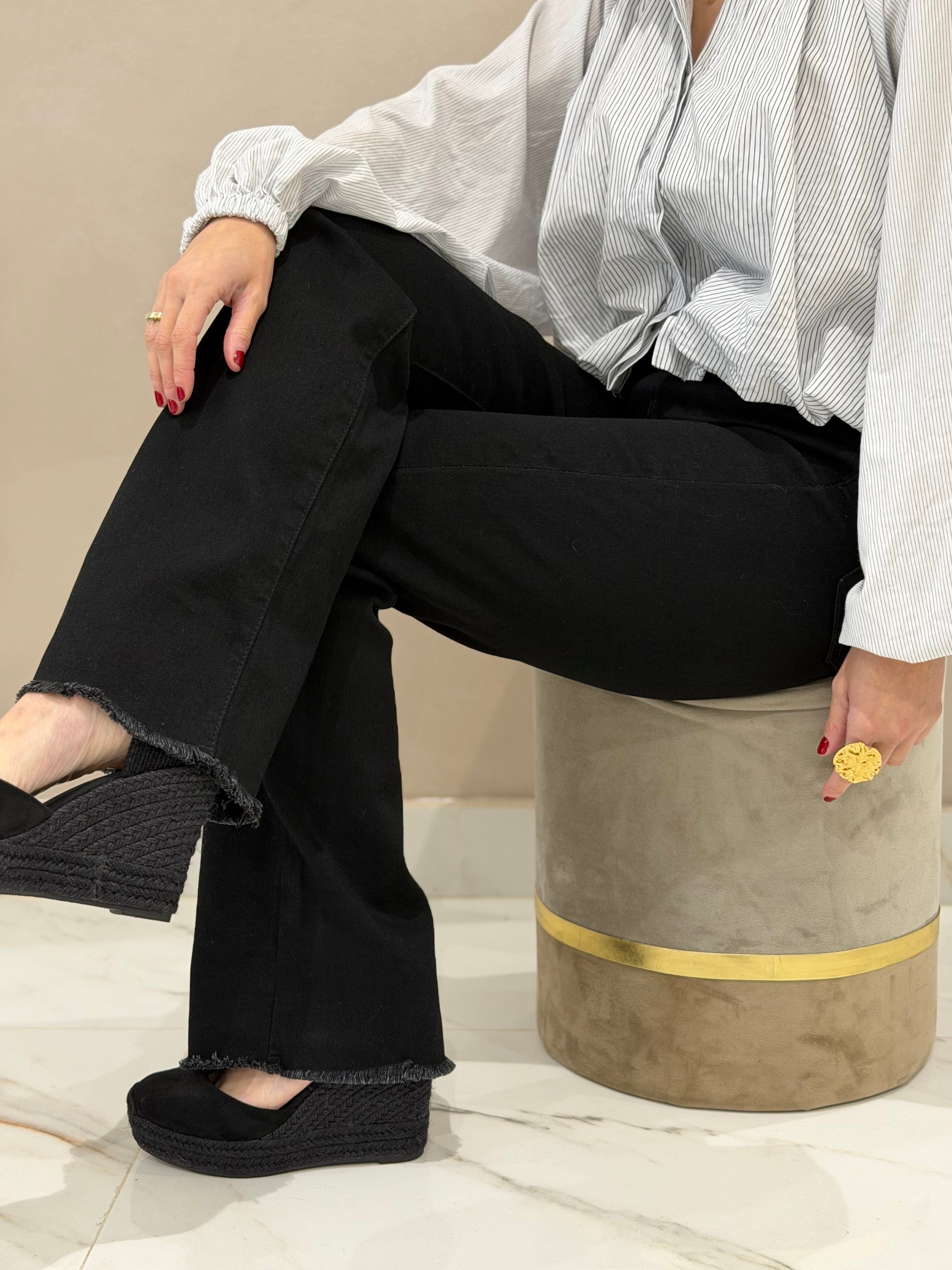 Jeans negro de tiro alto que proporciona una silueta favorecedora y soporte estructurado. Fabricado en tejido elástico que ofrece flexibilidad y comodidad durante todo el día sin perder forma. Equipado con cinco bolsillos funcionales para practicidad. El bajo desflecado aporta un detalle textural que moderniza el diseño clásico. Prenda versátil y atemporal que funciona como base sólida para cualquier guardarropa, adaptándose tanto a looks minimalistas como a propuestas más elaboradas con total versatilidad.